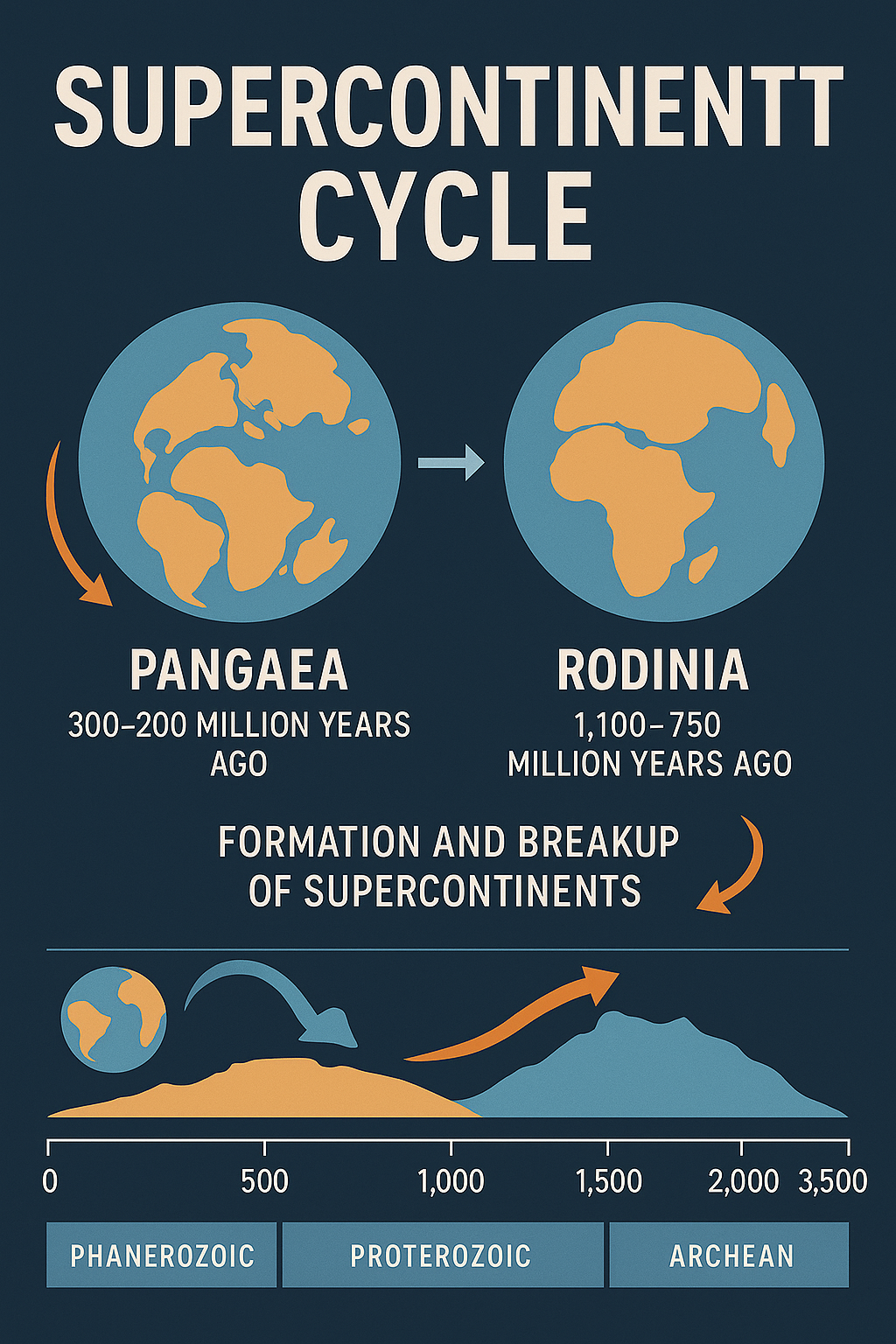 지구 과학자들은 슈퍼대륙이 약 5~7억 년 주기로 만들어졌다가 분열된다고 추정해요. 이런 과정을 슈퍼대륙 주기(Supercontinent Cycle)라고 불러요.