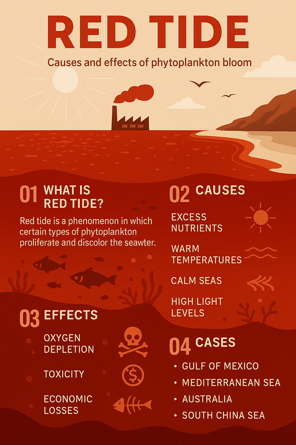 적조(Red Tide)는 해수 중 특정 종류의 미세조류(주로 식물성 플랑크톤)가 대량 번식하여 바닷물이 붉거나 갈색으로 변하는 현상입니다.