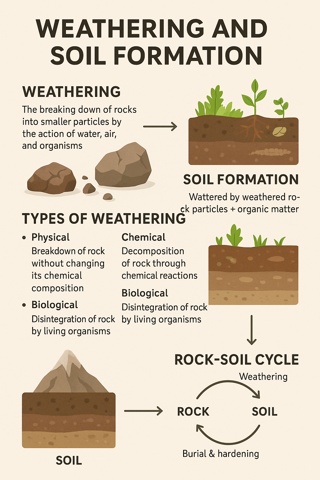 암석의 풍화와 토양 생성 과정을 설명하는 인포그래픽, 물리적·화학적·생물적 풍화 유형과 토양 형성 단계, 생태계와 지질 순환의 관계를 시각적으로 표현