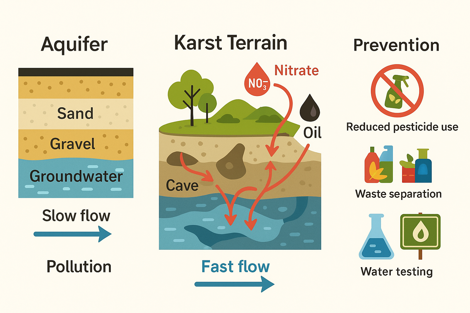 지하수 오염과 흐름, 대수층과 카르스트 지형 비교, 오염원 및 예방방법을 한눈에 보여주는 교육용 인포그래픽.