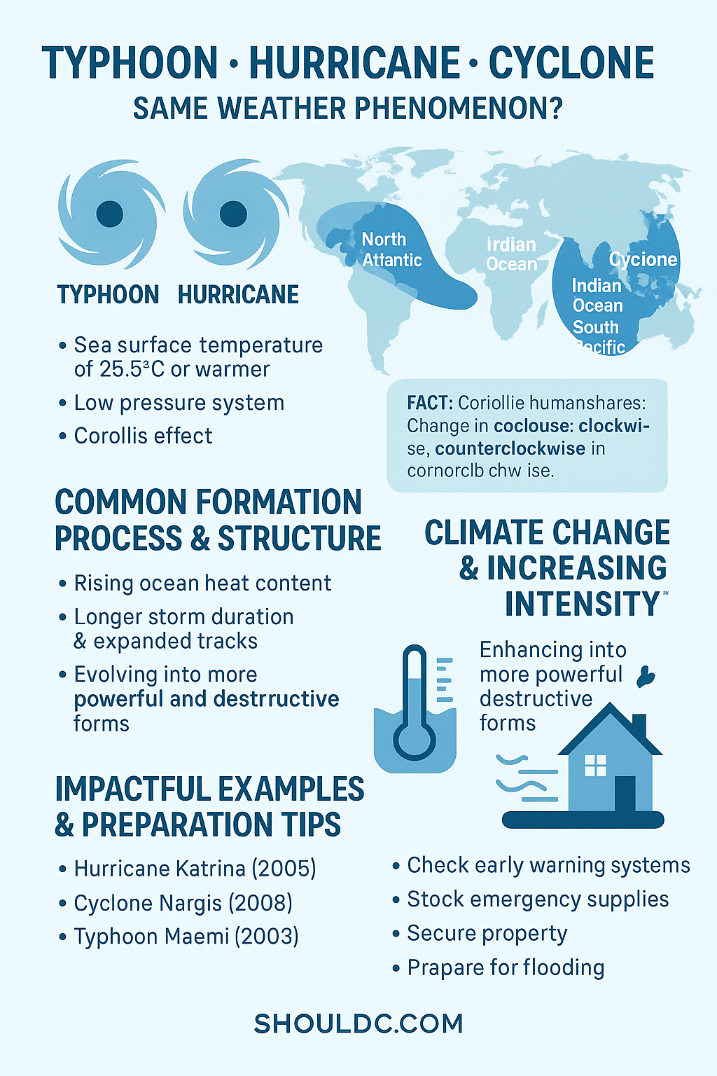 태풍, 허리케인, 사이클론은 모두 강력한 열대성 저기압이지만, 발생 지역에 따라 부르는 이름이 다릅니다. 그 원리와 구조는 동일하며, 해수 온도 상승과 기후 변화로 점점 강력해지고 있습니다. 이번 글에서는 이 세 용어의 차이, 공통된 형성 원리, 전 세계 피해 사례, 그리고 예측·대응 방법까지 살펴봅니다.