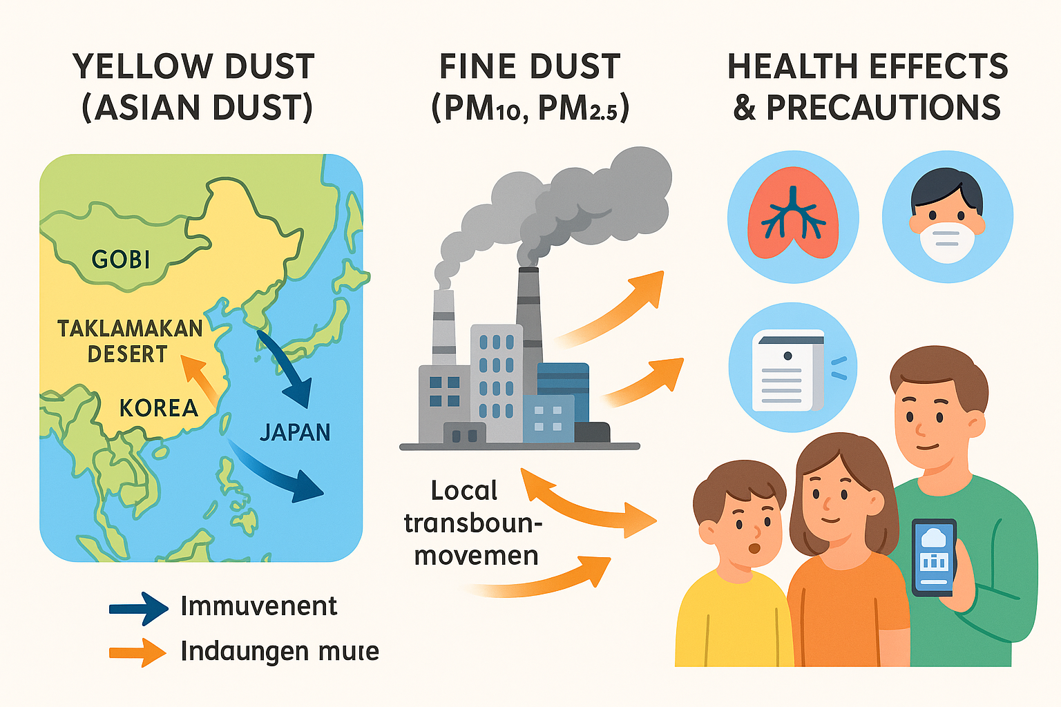 황사와 미세먼지는 각각 사막과 산업지대에서 시작해 우리나라까지 이동하는 복잡한 여정을 가지고 있어요. 건강에 큰 영향을 주는 이 현상들의 발생 원인과 이동 경로, 실생활 속 영향, 예방법까지 쉽게 정리해드립니다.