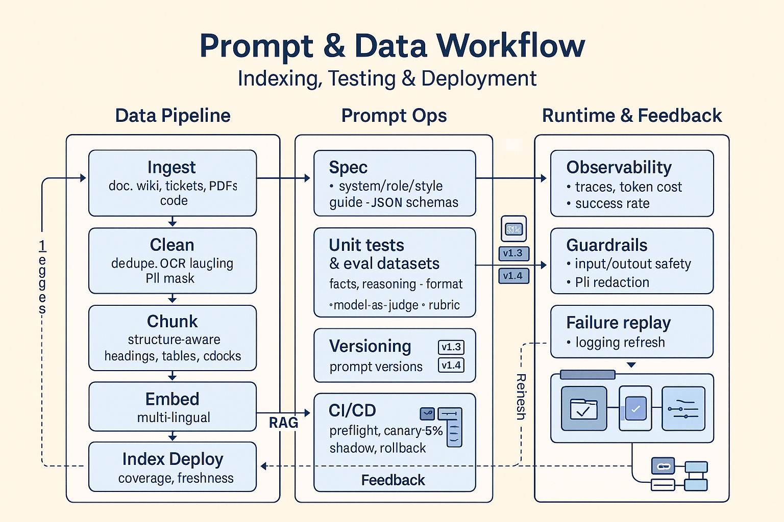 - 데이터 파이프라인: 수집 → 정제 → 청킹 → 임베딩 → 색인 배포 → 모니터링(커버리지·신선도).