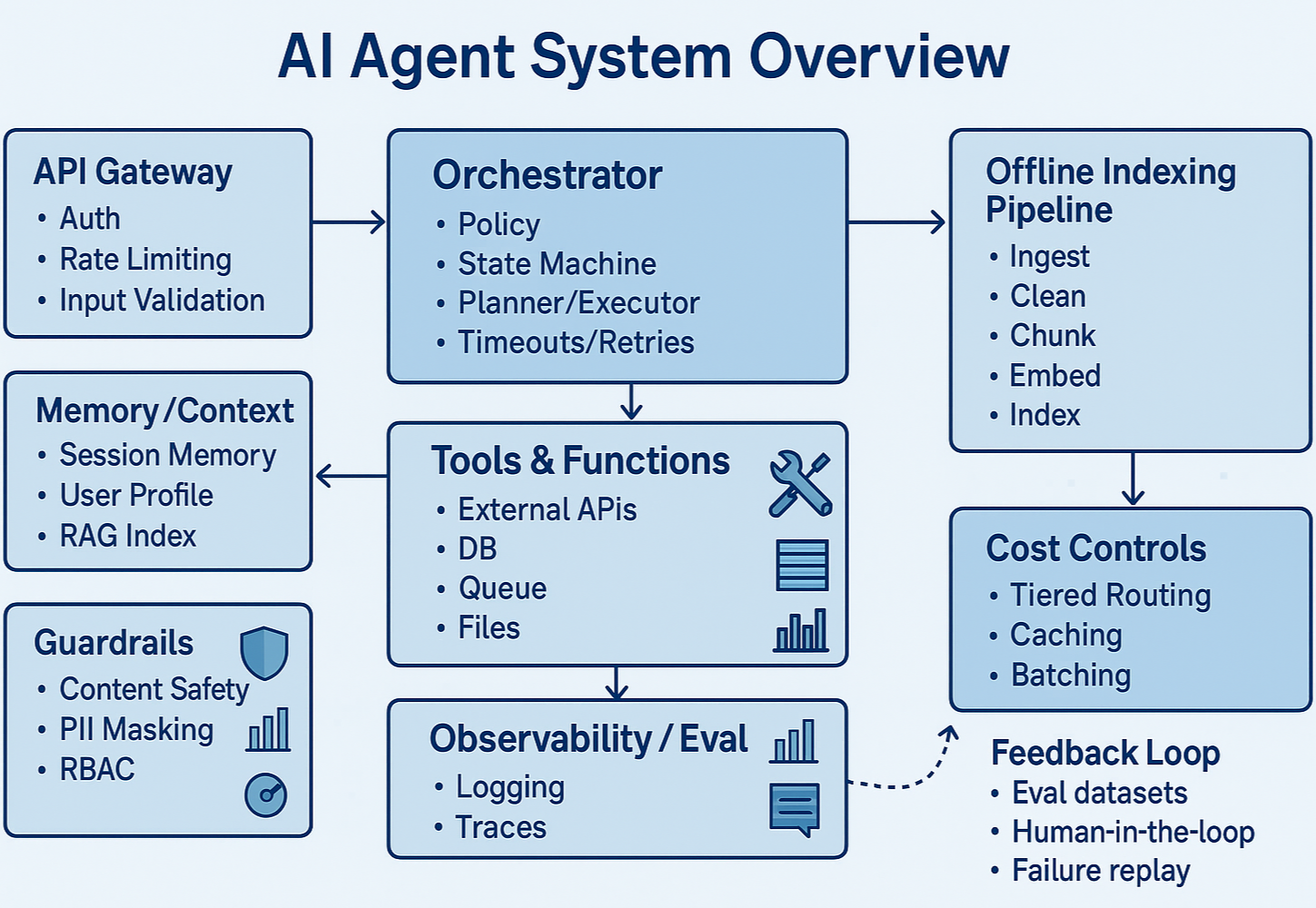 AI 에이전트를 올해 안에 실제 서비스로 돌리고 싶다면, 무엇부터 설계해야 할까요? 이 글은 2025년 관점에서 AI 에이전트 프로덕션 아키텍처, RAG 구현, 관측·평가·가드레일, 배포와 비용 최적화까지 한 번에 정리한 실전 가이드입니다. 팀 규모가 작아도 곧바로 적용 가능한 체크리스트와 예시를 담았습니다.