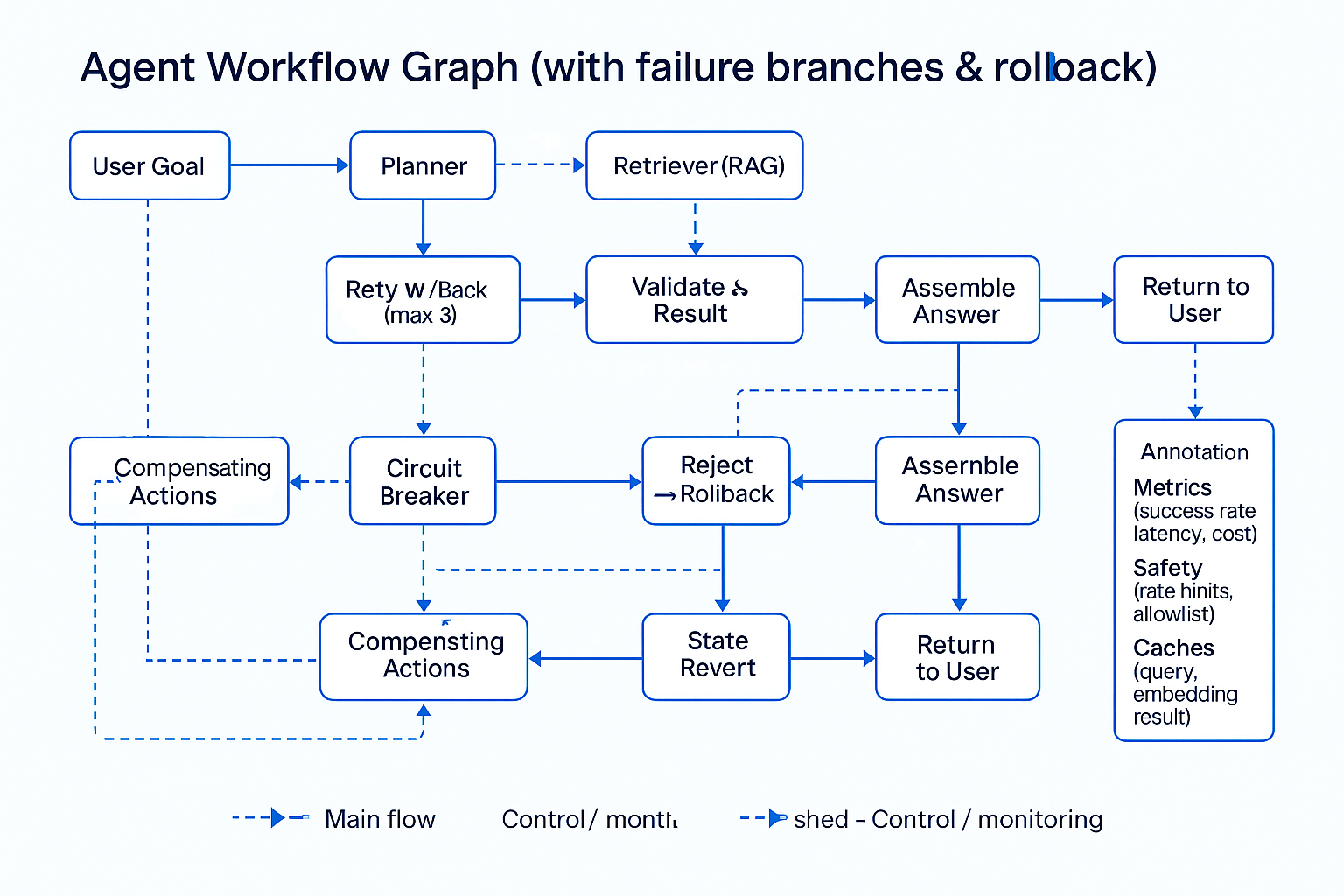 - 그래프 실행기는 최대 스텝/토큰/시간 제한으로 폭주를 방지합니다.