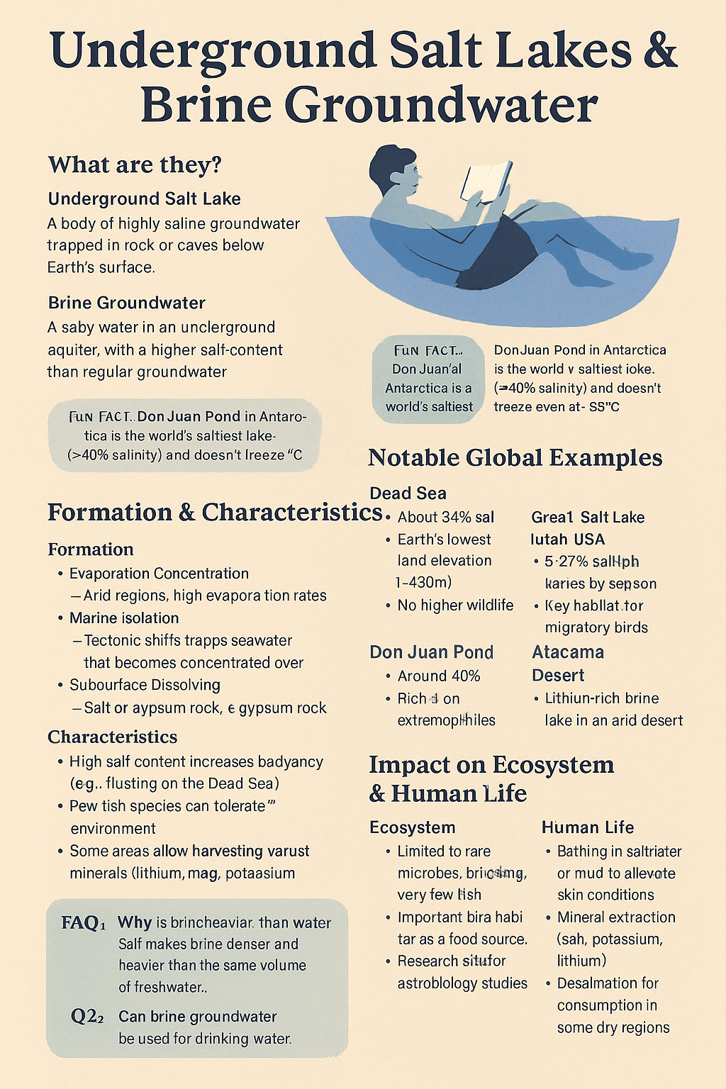 지하 소금호수와 염수 지하수는 단순히 짠 물이 아니라, 지구의 기후·지질 역사와 밀접한 연관을 지닌 자연의 보고입니다. 사해처럼 인류의 관광과 건강 산업에 기여하는 곳도 있지만, 동시에 귀중한 광물 자원과 과학 연구의 장이 되기도 합니다.