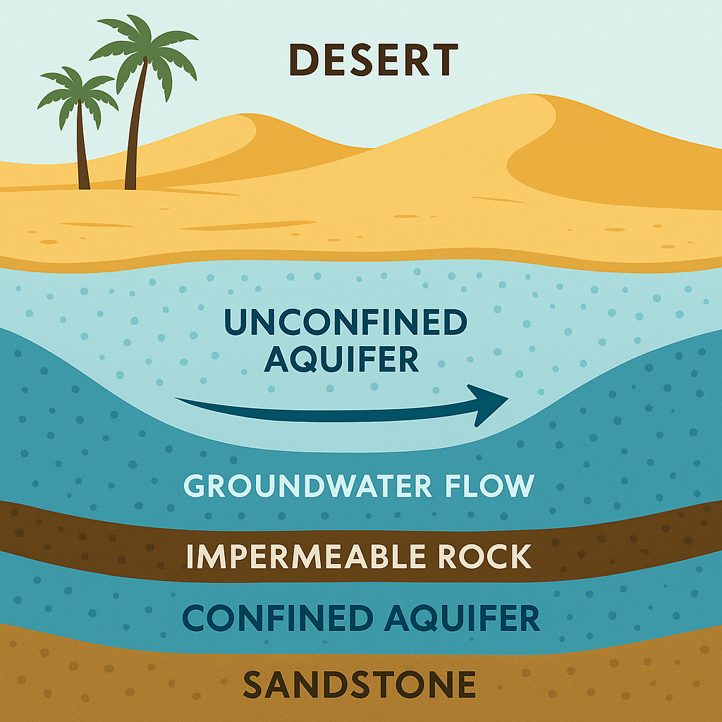 사막의 표면은 건조하고 메마르지만, 그 아래에는 암석층과 모래층 사이로 물이 흘러가며 지하강(aquifer flow)을 형성합니다. 이를 지하 암반수(groundwater in aquifers)라고 부릅니다.