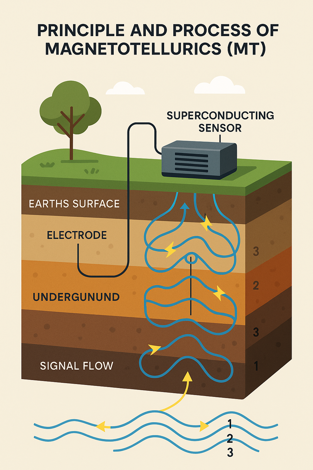 MT 탐사는 지구 표면에서 자연적으로 발생하는 전자기장(자연적인 전류와 자기장 변화, 예: 번개, 태양풍)을 측정합니다.
