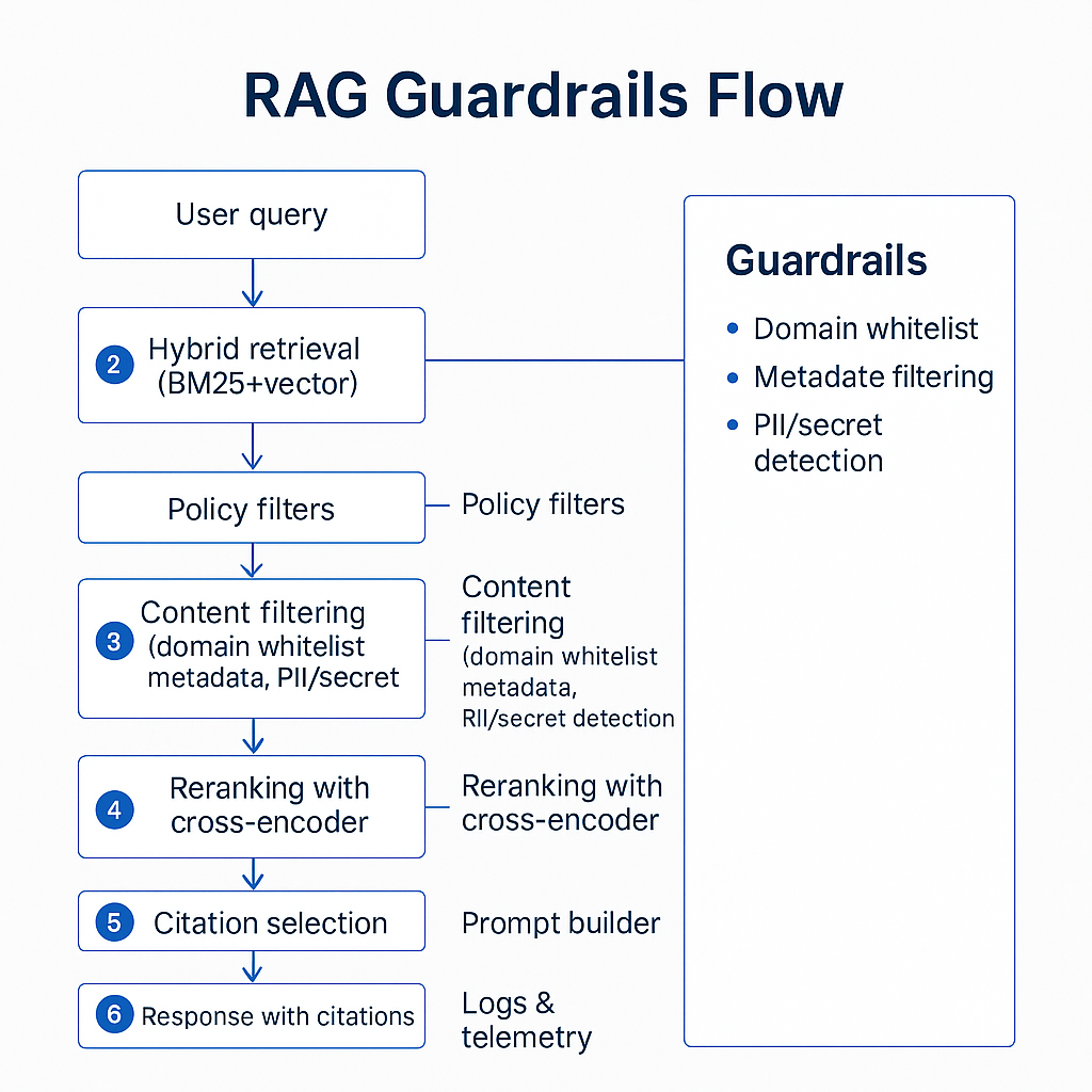 - 소스 화이트리스트: 신뢰 도메인만 인덱싱. 스크래핑 시 robots/policy 준수.